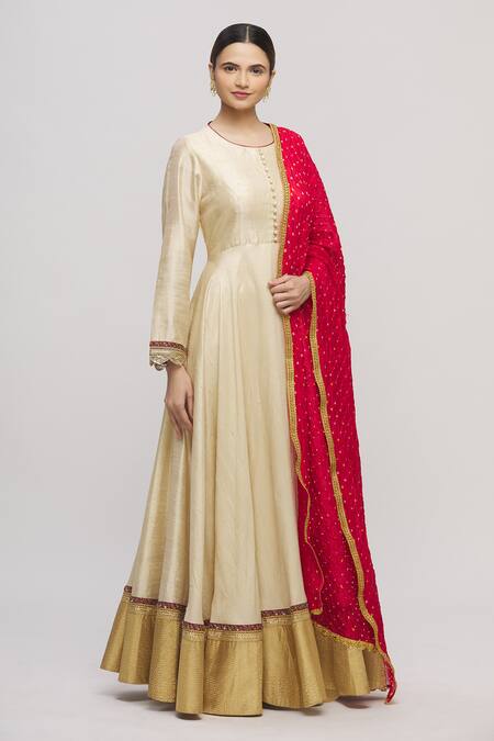 Beige anarkali with placement floral woven motifs & scallop lace trim sleeve hem. Comes with red bandhani dupatta.