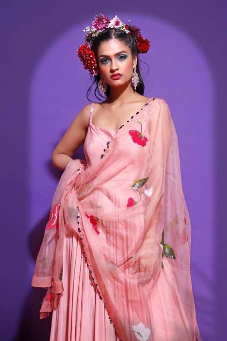 Pink anarkali with gathered flare & cowl neckline. Comes with floral motif sequin worked dupatta.
