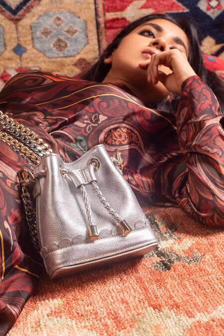 Silver mini bag in a metallic textured base. Comes with braided short handle and metal link sling chain.