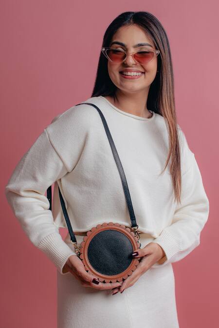 Tan & black leather mini bag in structured circular shape with milled textured pattern & scalloped cut work hem. Comes with detachable sling & waist belt strap.