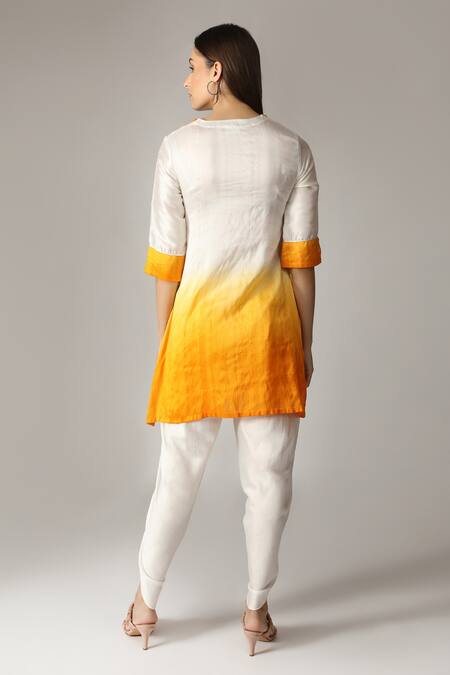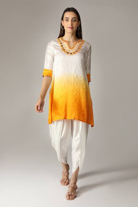 Orange & white ombre A-line short kurta with mirror, tassel, cut dana & beads hand embroidered yoke & notched round neck. Paired with pleated draped dhoti pant.