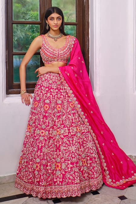 Pink silk lehenga with cutdana and sequins embroidery all-over. Paired with a zardosi blouse & dupatta with scallop border.
