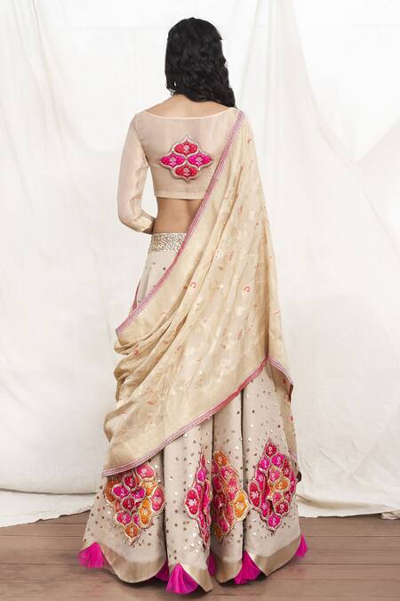Brown lehenga featuring hand embroidered banarasi quilted patches and a separate can-can. Paired with a non-padded blouse and banarasi dupatta adorned with mukaish and sequin work.