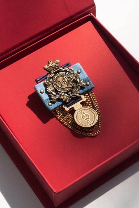 Blue embellished brooch featuring antique chains and a coin motif