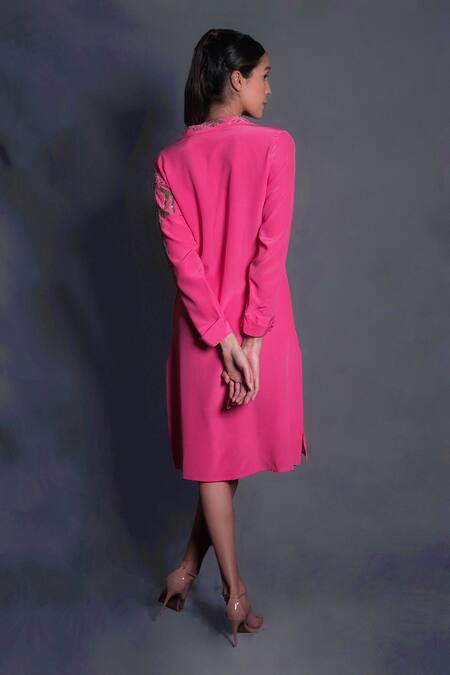 Pink Crepe Embroidery Collared Applique Dress