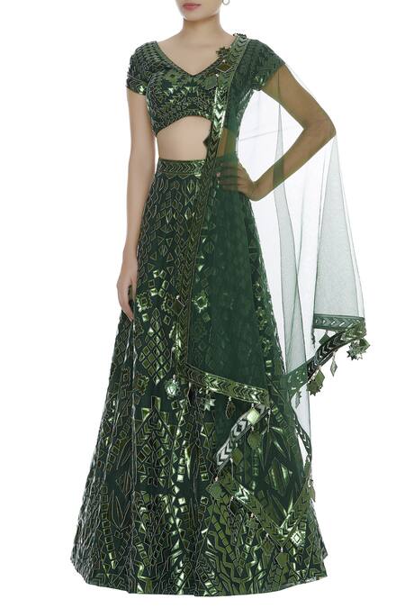 Buy_Reeti Arneja_Green Applique Leather Embroidered Lehenga Set_Online_at_Aza_Fashions
