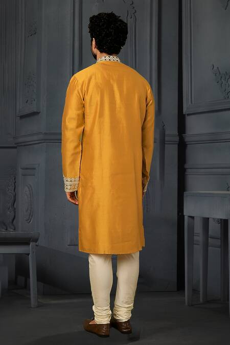 Buy_Sammohan Ceremonial_Yellow Vis Silk And Spun  Lining 100% Embroidery Thread Kurta Set_at_Aza_Fashions