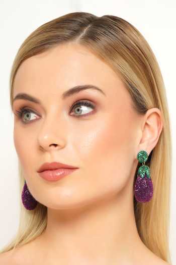 Purple and green handmade beaded dangle earrings adorned with cut and Japanese-quality beads and intricate embroidery. Silver-plated, hypoallergenic and lightweight, these handcrafted earrings are nickel and lead-free.