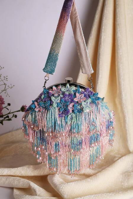 3D appliqued floral motifs, 3 layered beaded tassels, Comes with wristlet, Size (inches): L x B: 9.5 x 8, Weight (gms): 200, Closure: Metal clasp
