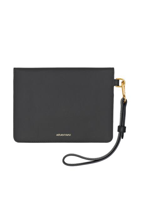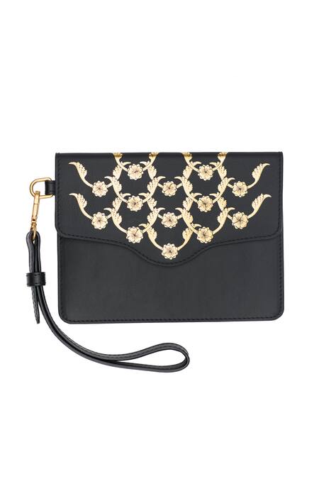 Black wristlet with floral pattern on flap and side sling holder.