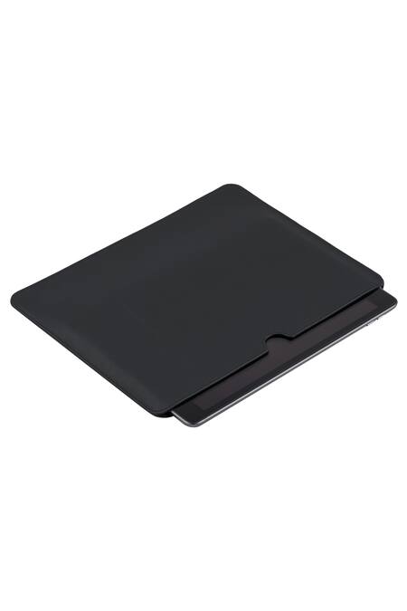 Black ipad sleeve with rectangle shaped and stitchline embroidery detailing.