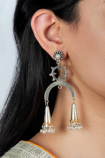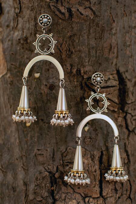 925 sterling silver statement earrings with arc shape, carved details, jhumka drops & pearl embellishment.