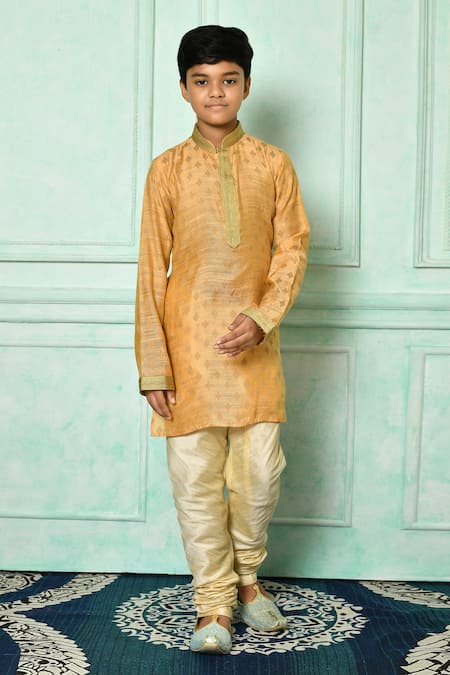 Orange dupion art silk kurta featuring embroidered placket and cuffs. Paired with a beige churidar for a complete look.