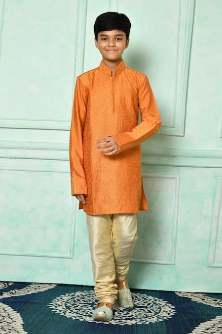 Mustard kurta featuring paisley embroidery on the front and an embroidered back yoke. Paired with a beige churidar made from dupion art silk.