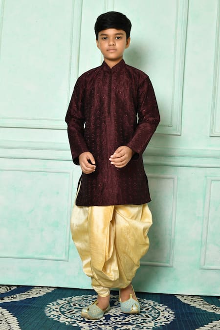 Shop_Petite Pomme_Wine Silk Embroidery Fleur De Lis Pattern Kurta With Dhoti Pant _Online_at_Aza_Fashions