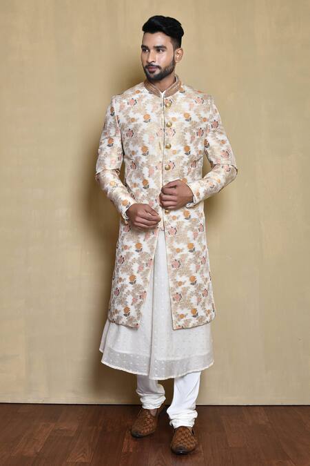 White sherwani featuring multi-colored floral woven motifs. Paired with an attached lining anarkali and semi-elasticated churidar.