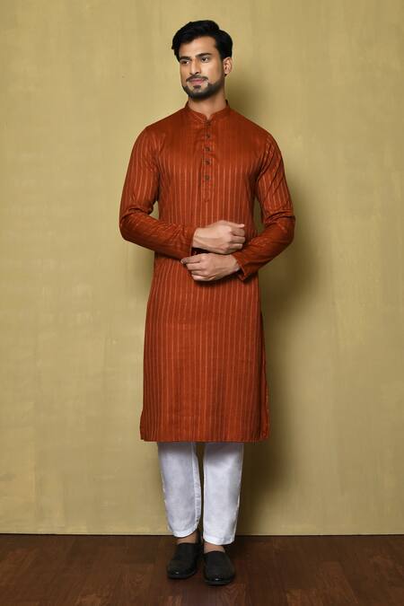 Buy_Arihant Rai Sinha_Orange Jacquard Silk Woven Stripe Full Sleeve Pattern Kurta_at_Aza_Fashions