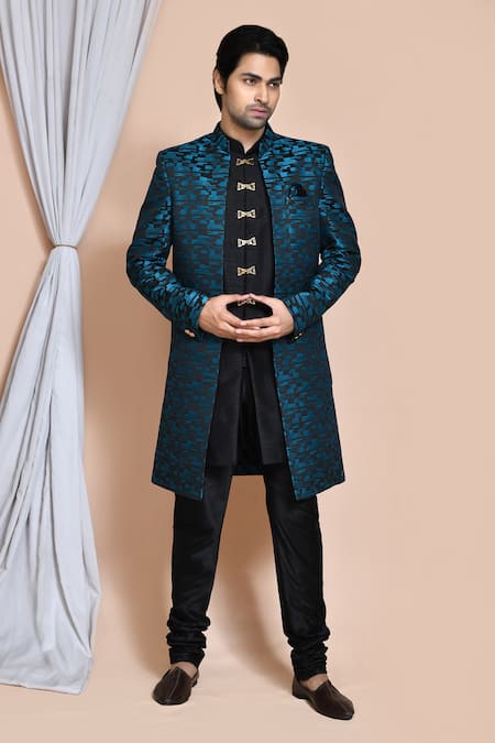 Teal sherwani jacket featuring an all-over geometric pattern. Paired with a black kurta and churidar.