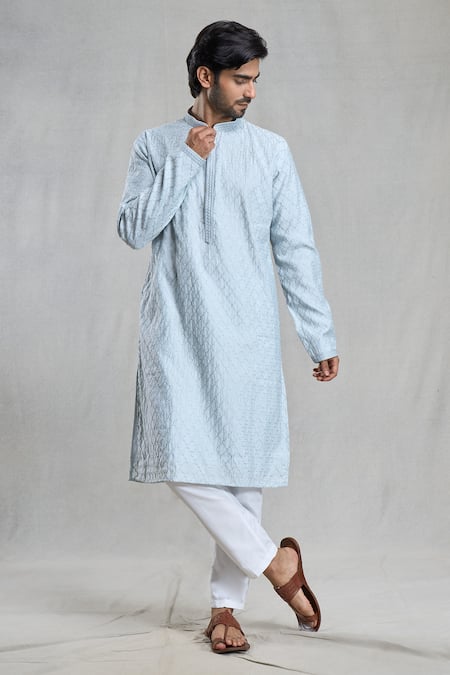 Sky blue kurta featuring geometric thread embroidery throughout. Paired with off-white pants for a complete look.