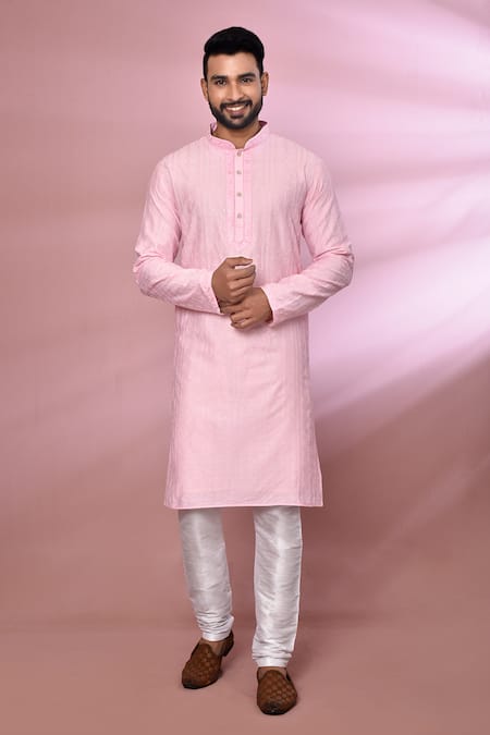Light pink kurta featuring a geometric stripe pattern with tonal thread embroidery. Paired with a white gathered churidar made of poly cotton.