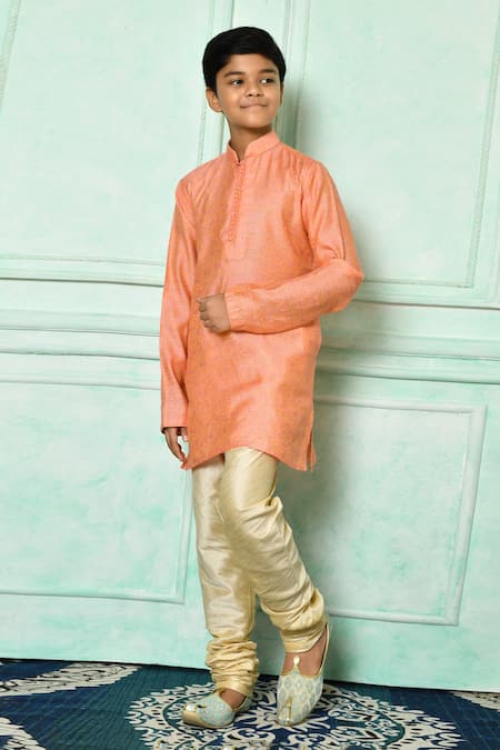 Peach cotton kurta featuring potli buttons on the placket. Paired with a beige churidar.