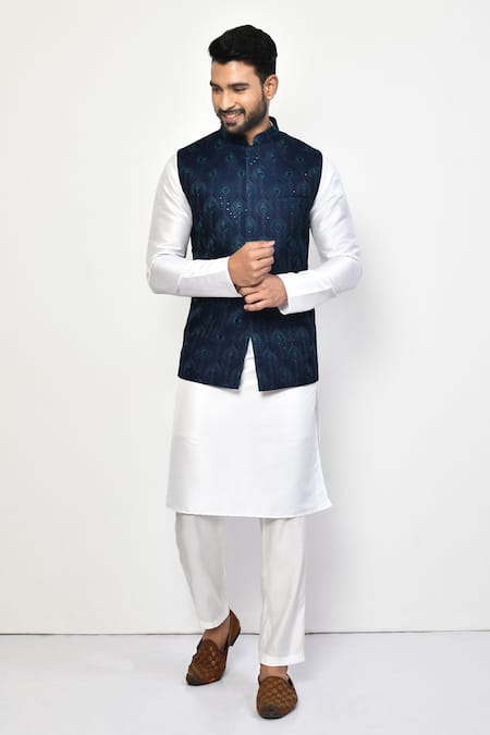 Blue bundi featuring all-over peacock feather embroidery. Paired with a white kurta and pant.
