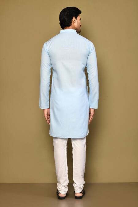 Blue kurta featuring a band collar and long sleeves with a buttoned placket