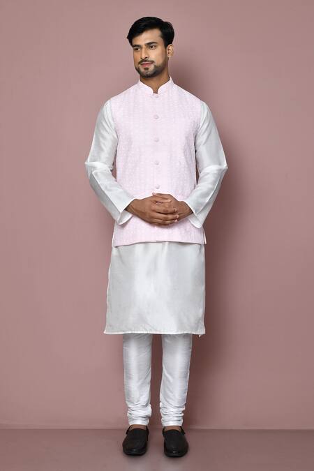 Light pink sleeveless bundi with thread embroidery crafted in silk. Paired with a solid white kurta and pyjama.