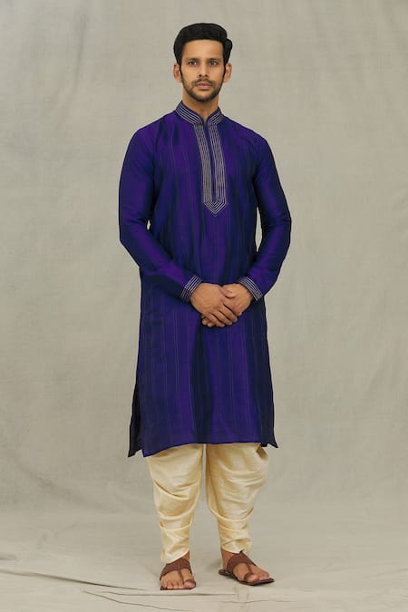 Blue art silk kurta featuring an all-over stripe pattern and running stitch thread embroidery. Paired with a contrast beige pleated cowl draped dhoti pant.