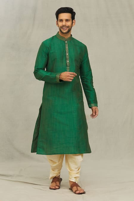 Green art silk kurta featuring a mandarin collar with thread work and a front button placket. Paired with a beige pleated cowl draped dhoti pant with an elasticated waistband.