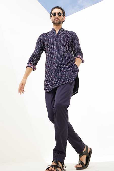 Navy blue kurta featuring embroidered floral motifs with multicoloured french knot embroidery in an angular stripe pattern. Paired with matching pants that include side pockets.