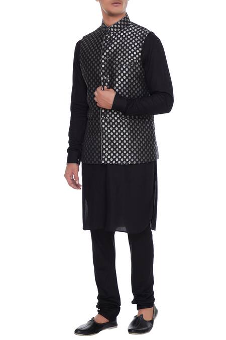 Black Chanderi Banarasi Silk Bundi And Kurta Set