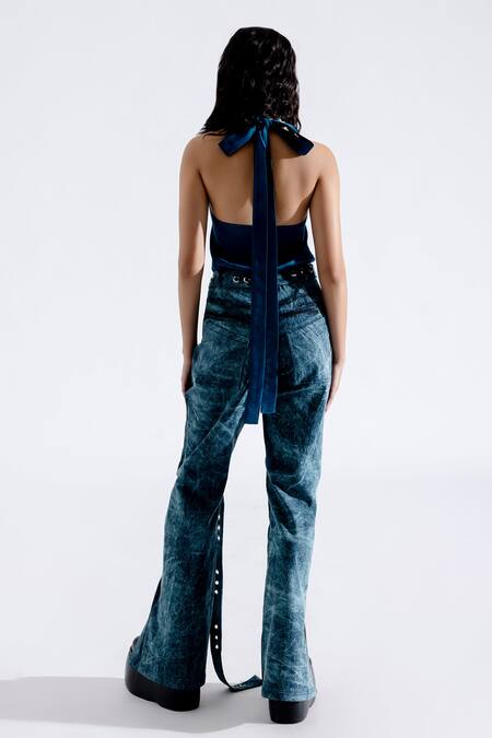 Blue modal satin halter neck top featuring pleated draped detail and overlap panel