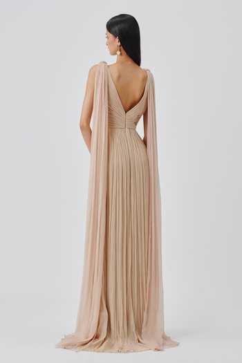 Ruched bodice, Attached shoulder drapes, Hand-ruched floor-length skirt