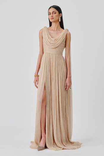 Cream Satin, Chiffon, Modal Cowl Neck Athena Ruched Gown