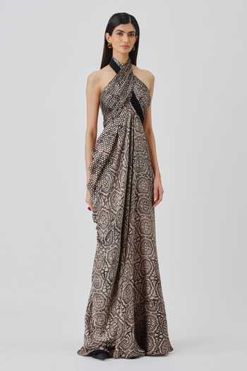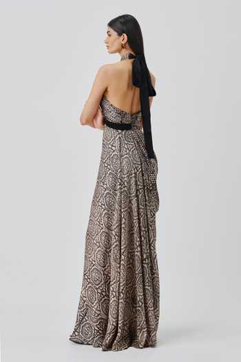 Beige and black halter neck gown in fluid modal satin with dual Ajrakh prints and a draped, hand-ruched bodice. A black satin band across the bust provides contrast and the floor-length silhouette falls with fluid, effortless movement.