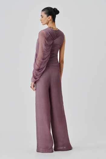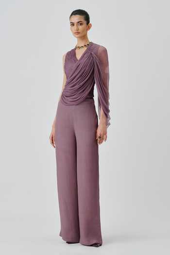 Purple Moroccan Crepe pant with a high-waisted, wide-leg silhouette and functional side pockets.