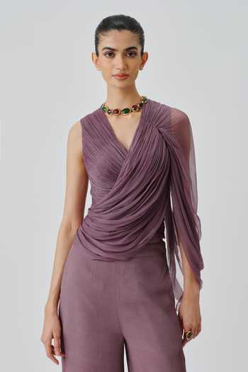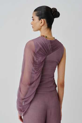 Purple Crepe, Chiffon V-neck, One Shoulder Mauve Ruched Top