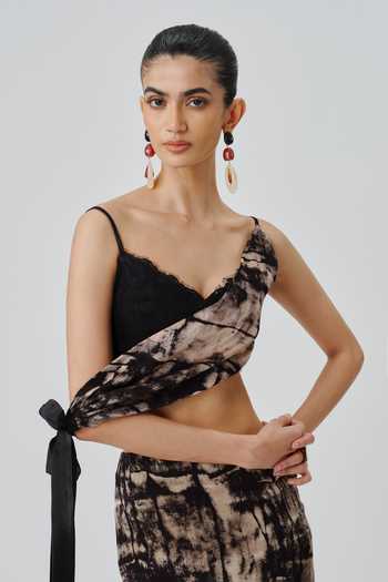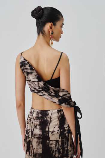 Black and beige modal satin crop top with side-tie drape and Ajrakh print.
