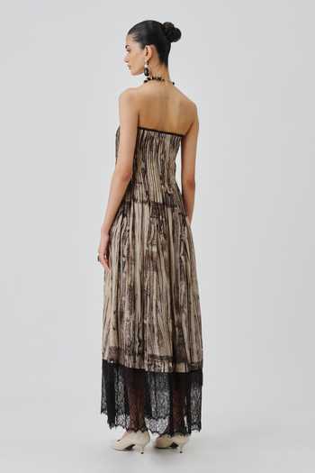 Black & Beige handblock printed Mul mul dress with pintucked bodice and strapless neckline, finished with layered chiffon and lace hem.