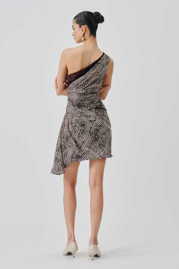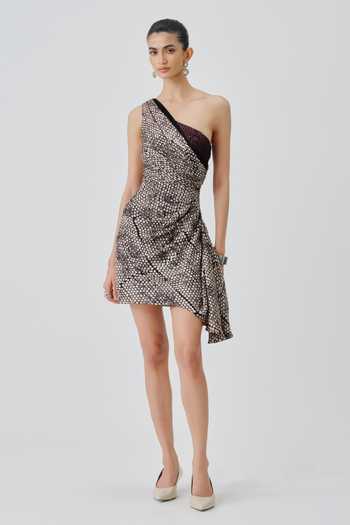 Beige, Black Modal Satin short dress with one-shoulder drape and hand-block printed Ajrakh pattern.