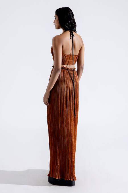 Bronze modal satin skirt featuring intricate pleated details and delicate contrast piping