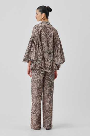 Beige & Black handblock-printed cotton shirt with voluminous statement sleeves and Ajrakh block print.
