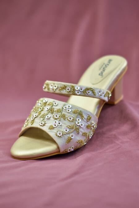 Beige heels featuring floral sequin embroidery and front open detailing