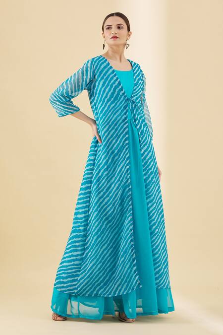 Blue long jacket with all-over leheriya print and tie up front. Comes with blue kurta.