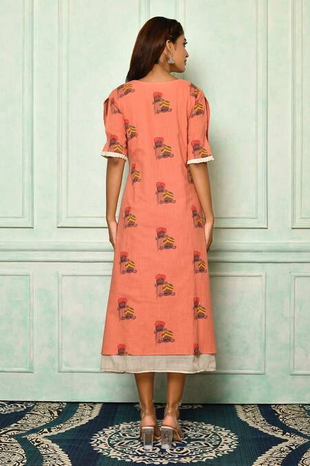 Peach Cotton Print Rajasthani Round Neck Men Pattern Long Tunic