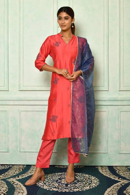 Coral Kurta Silk Chanderi Embroidery Mandarin Collar Straight Set