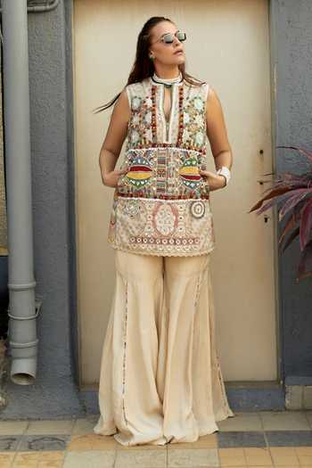 Multicolor sleeveless shift dress featuring intricate moti bharat, ikat, resham, thread, and bead embroidery. Paired with a flowing sharara in natural crepe fabric.