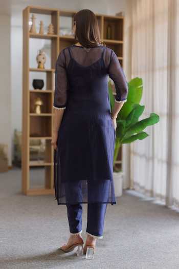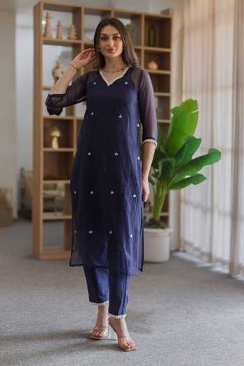 Navy blue doriya embroidered straight kurta set features a V-neckline trimmed in white lace and scattered white leaf embroidery on the kurta. Comes with a matching doriya dupatta with scalloped edges, a slip and pants with side pockets; kurta length 45 inches, pant 36 inches.