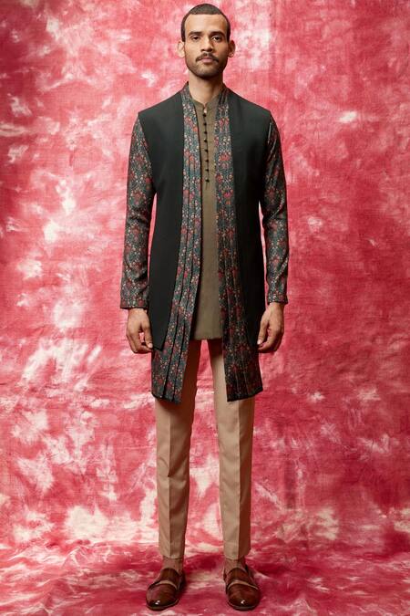 Black asymmetric jacket with floral print layered front. Comes with bottle green short kurta & pants.